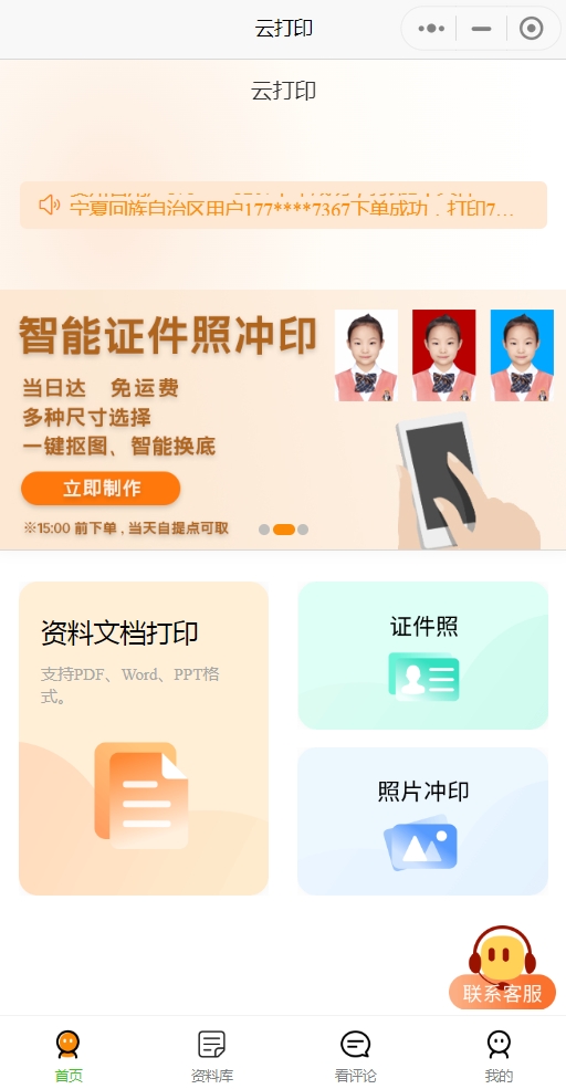 广东锋火云印小程序首页经过精心设计,采用了简洁直观的界面布局,以便用户能够快速访问和使用各项核心功能。首页上设置了三个主要功能区域,分别是“资料文档打印”、“证件照”和“照片冲印”,它们分别服务于不同的打印需求,极大地丰富了用户的云打印体验。
