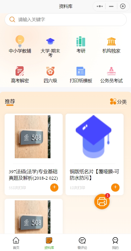 “资料库”包含“中小学教辅”、“大学期末考”和“考研”等多项学习打印,用户通过“资料库”可以便捷地搜索、预览和打印所需的各类学习资料,省去了寻找资料的繁琐过程,使学习变得更加高效便捷。同时,这些资料通常会随着最新的考试动态不断更新,确保用户能获得最新鲜、最有效的学习资源。