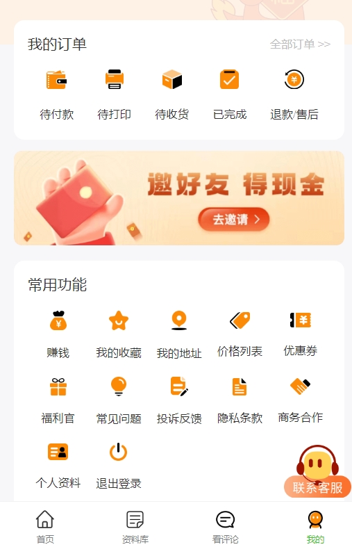 这里展示了用户的所有历史订单记录,包括待付款、待发货、待收货、已完成等不同状态的订单详情。用户可以方便地查看订单编号、打印内容、费用、下单时间、预计送达时间等信息,同时支持取消订单、申请退款、跟踪订单物流等功能,让用户对自己的打印订单做到心中有数。